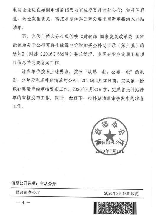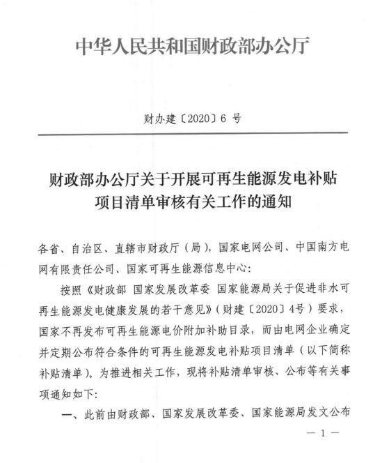 近日,財(cái)政部辦公廳印發(fā)《關(guān)于開(kāi)展可再生能源發(fā)電補(bǔ)貼項(xiàng)目清單有關(guān)工作的通知》(財(cái)辦建〔2020〕6號(hào)),開(kāi)展前七批目錄之外的存量可再生能源項(xiàng)目的申報(bào)工作。
