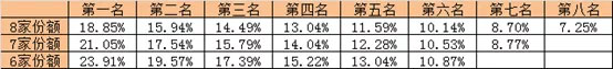 當(dāng)中標(biāo)人數(shù)量為7家時(shí),每個(gè)中標(biāo)人對(duì)應(yīng)的中標(biāo)份額依次為:第一名中標(biāo)份額為21.05%、第二名中標(biāo)份額為17.54%、第三名中標(biāo)份額為15.79%、第四名中標(biāo)份額為14.04%、第五名中標(biāo)份額為12.28%、第六名中標(biāo)份額為10.53%、第七名中標(biāo)份額為8.77%;