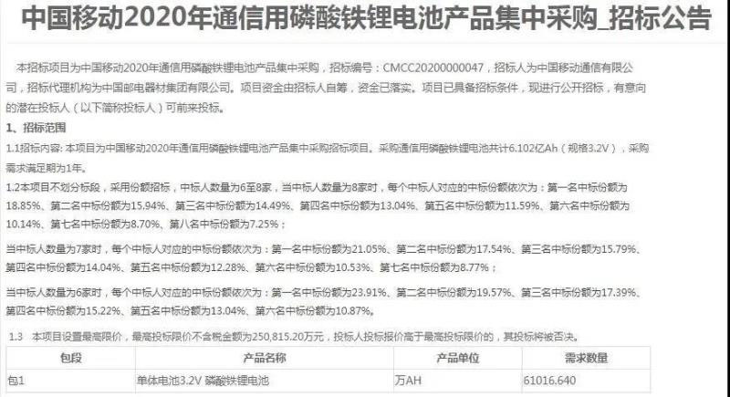 中國(guó)移動(dòng)2020年通信用磷酸鐵鋰電池產(chǎn)品集中采購(gòu)