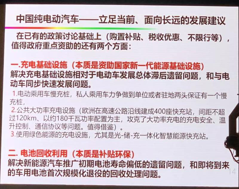 立足當(dāng)前,面向長遠(yuǎn)的一個建議。我們希望購置補貼、購置稅優(yōu)惠、不限行等等。同時,重點注意還有兩個方面,一個是充電基礎(chǔ)設(shè)施,充電基礎(chǔ)設(shè)施的本質(zhì)是資助國家新一代能源基礎(chǔ)設(shè)施。還有一個是電池回收利用,本質(zhì)是資助補貼環(huán)保,這是有制高點的。