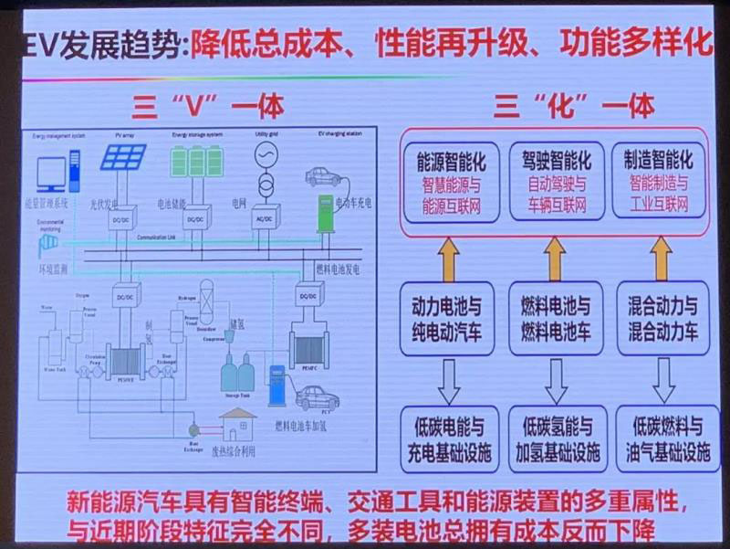 第三,功能多樣化,三V一體,V2G、V2H、V2X,V2H現(xiàn)在也開始了,就是建筑跟車輛,電驅(qū)系統(tǒng)一體化。三化一體,除了現(xiàn)在的電動化,還有能源的低碳化、系統(tǒng)的智能化,這是藍(lán)海。所以新能源汽車具有智能終端交通工具、能源裝置的多重屬性,如果到功能多樣化階段的時候也許客戶反而需要讓你給他裝多一點電池,這樣總成本反而降低,因為他可以利用電池作為儲能給電網(wǎng)放電獲取收益。