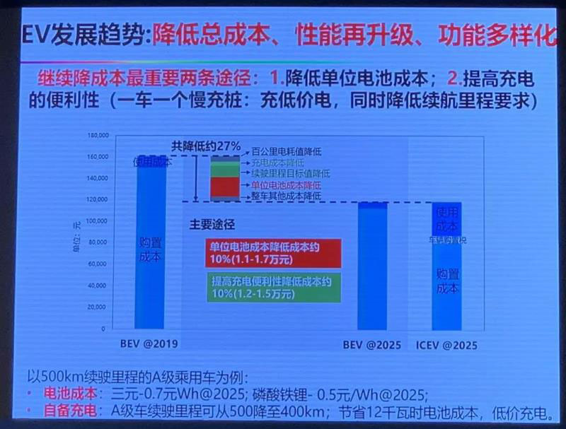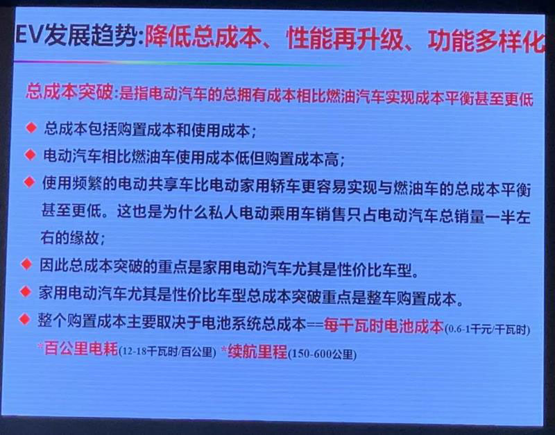 因此,總成本突破的重點是家用電動汽車,尤其是性價比車型,很貴的車不是性價比客戶的選擇,但是我們家用轎車最重要的、量最大的還是性價比客戶,所以這是最需要突破的重點。這個重點要突破的就是購置成本,因為使用成本家用的已經(jīng)是低的。