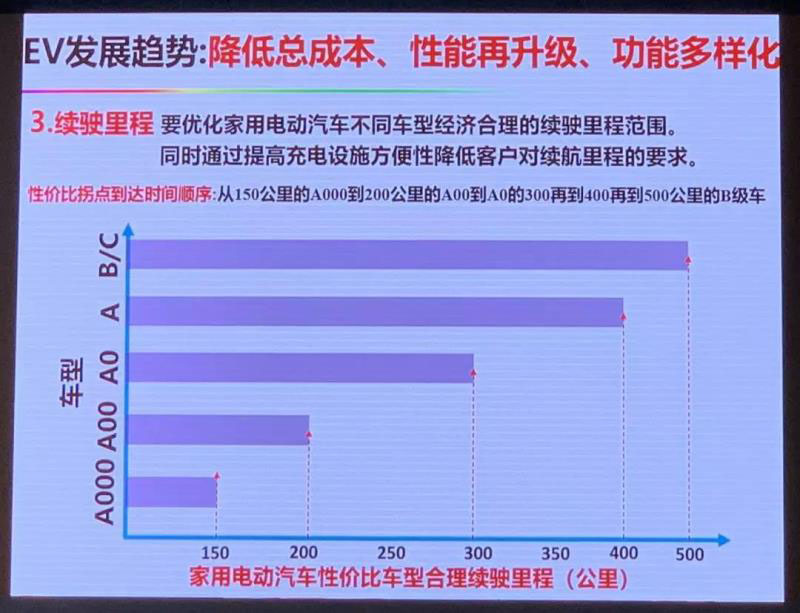 第一,要優(yōu)化家用電動汽車不同車型經(jīng)濟(jì)合理的續(xù)駛里程范圍,比方說A00級的、A0級的、A級的、B級的,這是不一樣的,不需要都強調(diào)續(xù)駛里程,但是最難的主攻目標(biāo)還是家用主流轎車就是A0級和A級,大概是在350—450km這個范圍,這是最重要的需要我們突破的地方。