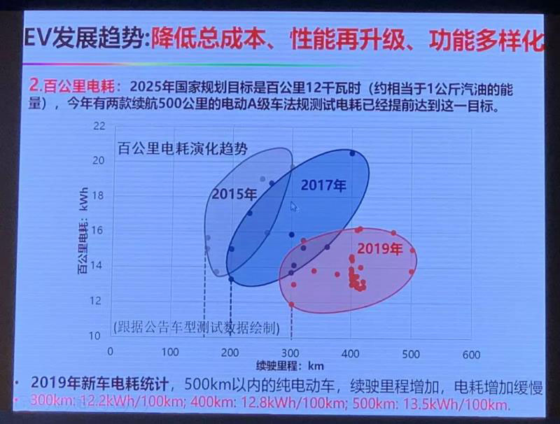 第二是百公里電耗。根據(jù)工信部檢測的電耗,可以看出,2015年、2017年到2019年續(xù)駛里程在升級,電耗普遍下降,而且變化的幅度在收窄,300—500km這個變化范圍收窄了,這是很好的現(xiàn)象。比如今年有兩款500km的電動轎車電耗在12 kWh /100km。