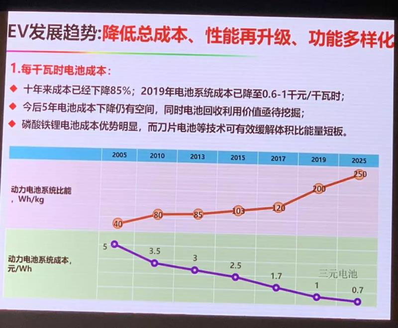 現(xiàn)在我們的電池系統(tǒng)成本已經(jīng)在0.6—1元/Wh,1元/ Wh是三元電池,低的是磷酸鐵鋰電池,今后5年電池成本仍有下降空間,比如說我們?nèi)姵?025年前到0.7元/ Wh,磷酸鐵鋰還有下降的空間,但同時需要強調(diào)電池回收利用價值亟待挖掘,這方面我想磷酸鐵鋰電池成本優(yōu)勢是非常明顯的,而刀片電池等技術(shù)可有效的緩解以前磷酸鐵鋰電池體積比能量的短板。對于一個A0級車型的體積可以裝到將近60 kWh,基本上可以解決續(xù)航里程問題。