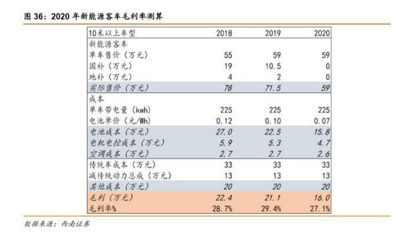 基于 2019 年已經(jīng)有很多一線整機廠采用 CTP 的方案進行上車測試,所以預計 2020 年 會于一部分的車型開始采用該技術。我們按照上文的假設,以 10 米以上的車型進行測算, 電池成本降低 30%,則電池成本從 22.5 萬降低到 15.8 萬,在沒有補貼的情況下,毛利率可 以維持。