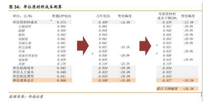 1) 刀片電池體積比能量密度提升 50%左右,在帶電量不變的情況下,體積減少了三分 之一左右,從而帶動鋁殼蓋板、PACK 成本下降,假設 33%降幅