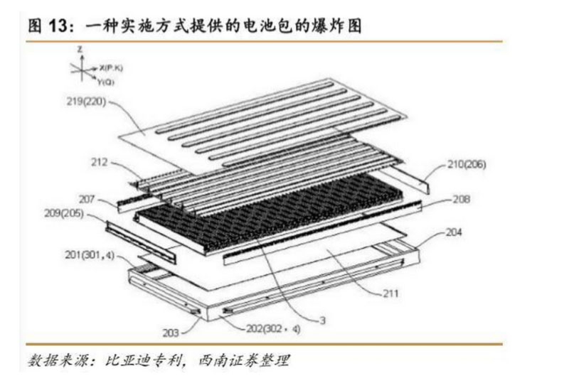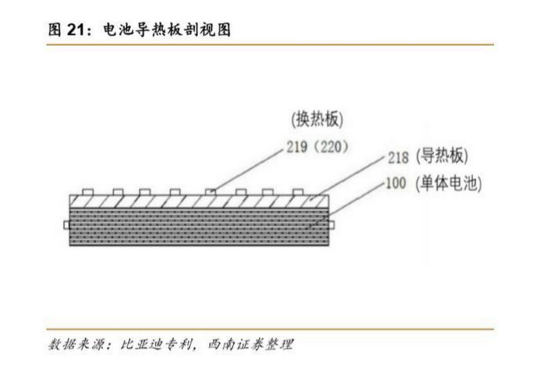 關于電池模組中散熱性能,比亞迪通過設置導熱板(下左圖 218 處)和換熱板來進行溫 度的控制,以保證單體電池散熱,并保證多個單體電池之間的溫度差不會過大。導熱板可以 由導熱性好的材料制成,例如導熱系數(shù)高的銅或鋁等材料制成。換熱板(下右圖 219 處)內(nèi) 部設置有冷卻液,通過冷卻液來實現(xiàn)對單體電池的降溫,使單體電池能夠處于適宜的工作溫 度。由于換熱板與單體電池設置有導熱板,在通過冷卻液對單體電池進行冷卻時,換熱板各 位置處的溫差可以通過導熱板進行均衡,從而將多個單體電池之間的溫度差控制在 1℃以內(nèi)。