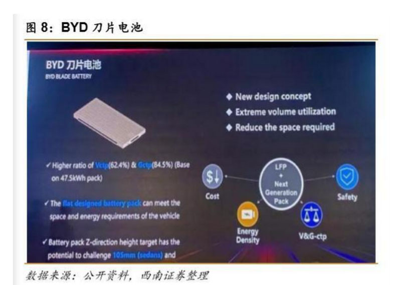 雖然比亞迪公布,會將刀片電池方案在漢上商用,但是商用車仍然會是率先使用的方案。 我們認為比亞迪在自己的乘用車上商用,就是為了突破一般的產(chǎn)業(yè)邏輯:新技術往往是在商 用車上推進,而乘用車使用會更加謹慎。比亞迪在自己的車上采用刀片電池,無疑是為了加 快乘用車的推進速度。其實刀片電池和 CTP 方案殊途同歸,都是為了進一步降低成本,而 單體電池變大之后,處于安全的考慮,磷酸鐵鋰成為首選。