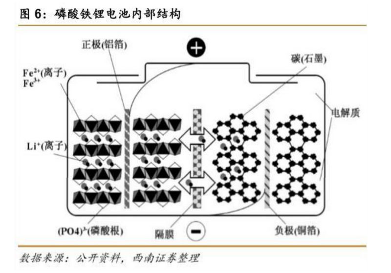 磷酸鐵鋰電池正極由橄欖石結構的 LiFePO4 組成,負極由石墨組成,中間是聚烯烴 PP/PE/PP 隔膜,用于隔離正負極、阻止電子而允許鋰離子通過。在充放電的過程中,磷酸 鐵鋰電池正極的離子、電子得失如下: