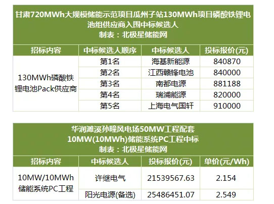 甘肅720MWh大規(guī)模儲能示范項目瓜州子站130MWh項目磷酸鐵鋰電池組中標(biāo)候選人如下: