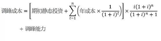 依據(jù)期初靜態(tài)投資、年成本、經(jīng)濟(jì)壽命、調(diào)峰能力等為參數(shù),測算和分析儲(chǔ)能等不同調(diào)峰資源的單位年調(diào)峰成本。計(jì)算公式為: