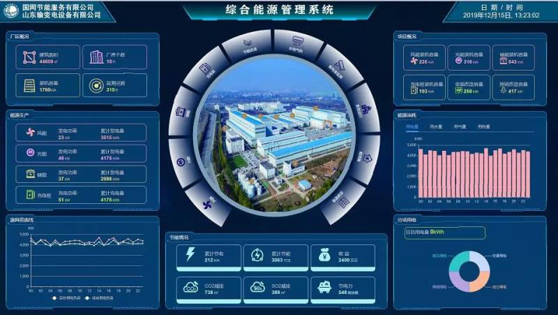 為此,國網節(jié)能公司聯(lián)合國內特大型變壓器制造板塊領軍品牌——山東輸變電設備有限公司,運用最先進的泛在物聯(lián)成果技術,共同開展涵蓋節(jié)能改造、可再生能源開發(fā)利用、儲能、智能配電室及能源管理系統(tǒng)的建設項目,實現(xiàn)多能互補、源網荷儲協(xié)同,有效降低廠區(qū)能源消耗,提高廠區(qū)可再生能源利用水平。同時通過對整個廠區(qū)的能源數(shù)據進行采集、統(tǒng)計、分析,實時提供在線能源系統(tǒng)重要參數(shù)和相關數(shù)據信息,確保能源系統(tǒng)平衡調整的科學性、及時性和合理性,從而提高能源利用水平,實現(xiàn)生產工序用能的優(yōu)化分配及供應,保證生產及動力工藝系統(tǒng)的穩(wěn)定性和經濟性,并最終實現(xiàn)提高整體能源利用效率的目的。