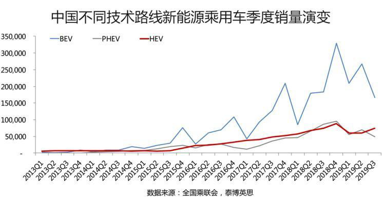 同樣的情形在歐美等國也正在發(fā)生之中。以德國為例,2019年1-10月份德國純電動乘用車市場較上年同期增長74%,至5.5萬輛規(guī)模;與此同時,德國混合動力乘用車市場較上年同期增長93%,至15.6萬輛規(guī)模,混合動力乘用車市場規(guī)模是純電動乘用車市場規(guī)模的2.8倍之多。