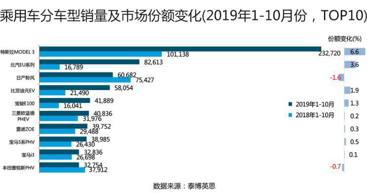 上述市場表現(xiàn)具體到車型層面來看:2019年1-10月,特斯拉Model 3以13.4%的市場份額占據(jù)首位,且市場份額凈增6.6個百分點;而日產(chǎn)聆風(fēng)則出現(xiàn)了顯著的銷量同比下滑,且市場份額下降1.6個百分點;和日產(chǎn)聆風(fēng)遭遇銷量和市場份額雙降的還有豐田普銳斯PHEV。
