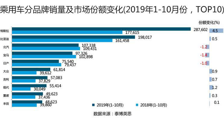 從品牌角度來看:2019年1-10月份,比亞迪和特斯拉均以超過10%的市場占有率居于領(lǐng)先地位,且市場份額在2019年獲得了顯著的增加;與之相反的是,寶馬、北汽和日產(chǎn)品牌均出現(xiàn)市場份額的顯著下降,其銷量相比去年同期而言也呈現(xiàn)小幅回落態(tài)勢。