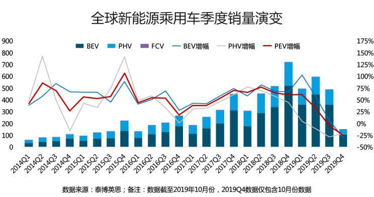 進一步觀察全球新能源乘用車市場的季度銷量演變歷程,自2018年二季度開始,全球新能源乘用車季度銷量增幅呈現(xiàn)持續(xù)回落態(tài)勢,其中,PHEV車型回落速度顯著快于BEV車型。尤其是進入2019年下半年之后,在中國市場的直接拉動下,2019年三季度全球新能源乘用車銷量首次出現(xiàn)下降。2019年四季度第一個月的全球新能源乘用車市場表現(xiàn)更值得堪憂,當月總體降幅高達25%,其中純電動細分市場降幅29%,插電式混合動力市場降幅21%。