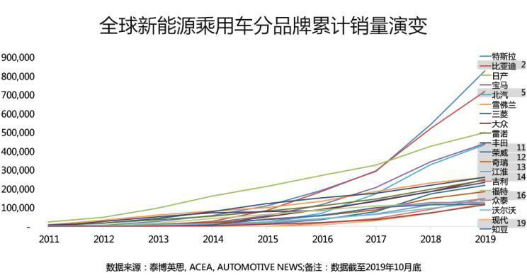隨著全球新能源乘用車市場的快速成長,特斯拉、比亞迪和日產(chǎn)在全球新能源乘用車市場快速崛起,并居于領(lǐng)先地位;除比亞迪外,北汽、榮威、奇瑞、江淮、吉利、眾泰和知豆等中國品牌均躋身于全球新能源乘用車累計銷量前二十名之列;與之相對應(yīng)的是,傳統(tǒng)燃油車領(lǐng)域的強勢品牌,如大眾、豐田和福特等品牌的累計銷量和排名均相對靠后。