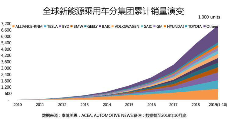 ●截至2019年10月,全球新能源乘用車累計銷量突破700萬輛大關(guān),大中華區(qū)以超過320萬輛的累計銷量占據(jù)全球46%的市場份額,排名第一;