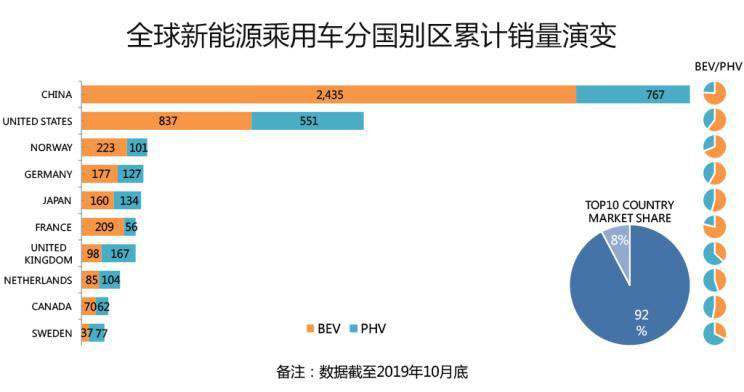 分國別來看,截至2019年10月底,中國、美國、挪威、德國、日本、法國、英國、荷蘭、加拿大和瑞典這十個國家的新能源乘用車累計銷量均超過10萬輛,且上述十國的新能源乘用車累計銷量全球占比超過92%,由此可見,全球新能源乘用車的推廣依然集中在一些頭部市場,尤其中美兩國居于顯著的領(lǐng)先地位。