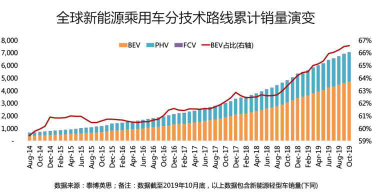 2019年,全球新能源乘用車市場雖然增速明顯放緩,但依然跨越了600萬這座高峰,并在2019年10月越過又一個重要的里程碑——累計銷量達704萬輛——突破700萬輛大關(guān);其中,純電動(BEV)車型累計實現(xiàn)銷量468萬輛,占比66.6%,插電式混動(PHEV)車型累計實現(xiàn)銷量234萬輛,占比33.2%,燃料電池(FCV)車型累計實現(xiàn)銷量1.7萬輛,占比0.2%。