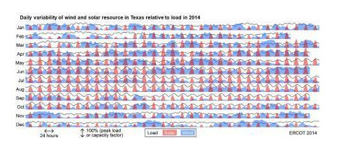 圖 | 高波動(dòng)性的太陽(yáng)能和風(fēng)能。(來(lái)源:MIT Analysis, NSRDB, ERCOT, P. Brown)