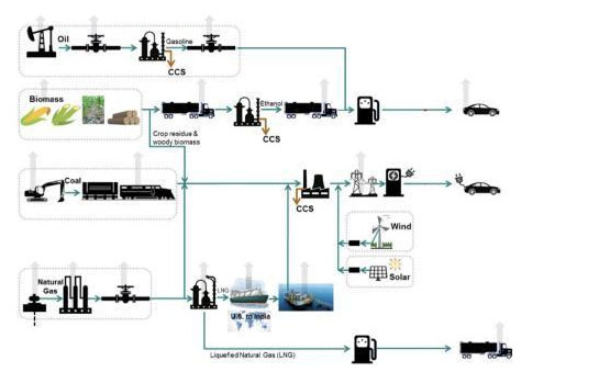 其次,電力的生產(chǎn)和消費(fèi)是在整個(gè)經(jīng)濟(jì)社會(huì)層面聯(lián)動(dòng)的。除了在發(fā)電環(huán)節(jié)降低碳排放,我們還需要跨行業(yè)、跨領(lǐng)域的技術(shù)。例如,我們可以利用電動(dòng)汽車或燃料電池等電氣化手段,來(lái)同時(shí)降低發(fā)電和交通層面的碳排放。為交通工具提供能量的,可以是柴油、汽油,也可以是電能、生物質(zhì)能。在這些不同的路徑中,我們都可以進(jìn)行碳封存和碳捕獲,讓整體的排放量更低。