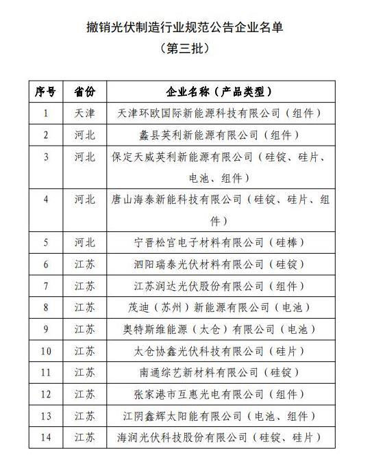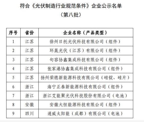 工信部公告《光伏制造行業(yè)規(guī)范條件》企業(yè)名單(第八批)和擬撤銷光伏制造行業(yè)規(guī)范公告企業(yè)名單(第三批)