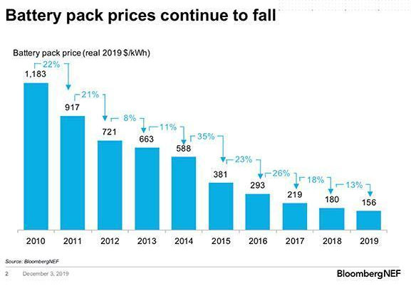 報告稱,2019年全球鋰離子電池組的價格下降主要?dú)w功于電動車銷量上升、電池訂單增加和高能量密度正極材料的快速推廣應(yīng)用。另外,新的電池包結(jié)構(gòu)設(shè)計(jì)的引入和更低的生產(chǎn)成本,也在短期內(nèi)推動著電池價格的下降。
