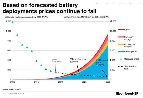 據(jù)預(yù)測,2024年全球鋰離子電池累計(jì)需求量將超過2億千瓦時,價格將降至100美元/千瓦時以下,這個價格被認(rèn)為是電動車與燃油車實(shí)現(xiàn)購置平價的臨界點(diǎn)。而在2030年,全球鋰電池均價或?qū)⒌椭?1美元/千瓦時,當(dāng)然這其中還存在諸多變數(shù)。