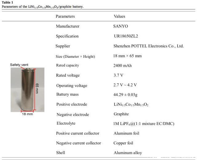 試驗中采用的鋰離子電池為18650電池,電池的基本信息如上表所示,電池的正極為NCM111材料,負(fù)極為石墨材料,額定容量2400mAh,分別測試該電池在5%、50%、90%和100%SoC狀態(tài)下的熱穩(wěn)定性。