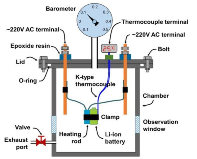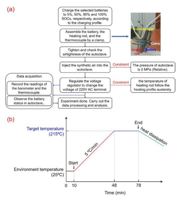 試驗流程如下圖所示,首先將電池的SoC狀態(tài)調(diào)整到5%、50%、90%和100%SoC,然后將電池、熱電偶和加熱電阻組合在一起,將電池裝入到裝置中后,向其中充入人造空氣(O2:N2=2.1:7.9),然后按照下圖b所示的加熱制度為鋰離子電池進(jìn)行加熱。