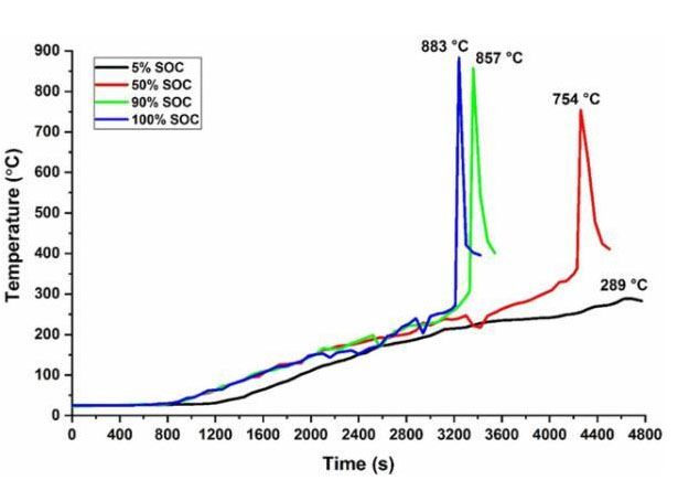 下圖為不同SoC的電池在上述的測試中電池表面溫度的變化,從圖中能夠看到90%和100%SoC的電池在55min左右時都出現(xiàn)了一個溫度的快速升高,最高溫度分別達(dá)到了857℃和883℃,而5%SoC的電池在整個試驗中沒有出現(xiàn)溫度劇烈升高的現(xiàn)象,最高溫度也僅為289℃,遠(yuǎn)低于其他電池。