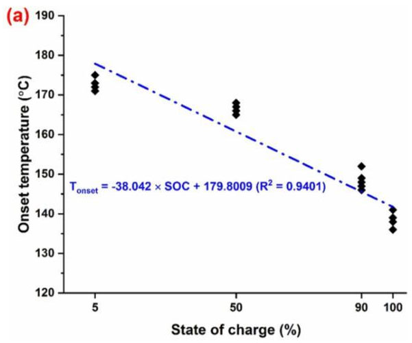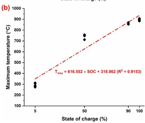 在下圖中作者對不同SoC電池在熱濫用測試中的熱失控起始溫度和最高溫度進(jìn)行了線性擬合,從擬合結(jié)果可以看到隨著電池SoC的升高,電池?zé)崾Э氐钠鹗紲囟瘸霈F(xiàn)了線性的降低,熱失控中達(dá)到了最高溫度則隨著SoC的升高而增加,表明較高的SoC會導(dǎo)致鋰離子電池的熱穩(wěn)定性顯著降低。