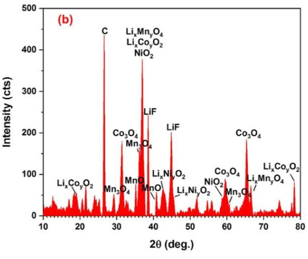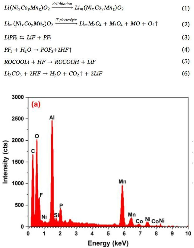 通過XRD分析可以發(fā)現(xiàn),這些顆粒主要成分除了C外,還有鋰/過渡金屬元素的氧化物L(fēng)ixM2O4(M=Co、Ni、Mn),以及過渡金屬氧化物MmOn(M=Co、Ni、Mn),表明這些顆粒中有相當(dāng)一部分為正極材料的分解產(chǎn)物,試驗數(shù)據(jù)顯示在熱失控中電池的最高溫度達(dá)到了850℃以上,研究表明在這一溫度下,NCM111材料會被分解為無序LixM2O4和M3O4尖晶石結(jié)構(gòu)產(chǎn)物,以及MO巖鹽結(jié)構(gòu)相產(chǎn)物(反應(yīng)如下式1和2所示)。從下圖b中能夠看到LiF數(shù)量也比較多,LiF主要來自于LiPF6在高溫下的分解(反應(yīng)如下式3-6所示)。