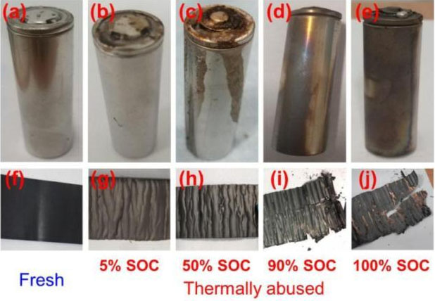 下圖為新電池和不同SoC狀態(tài)熱濫用后電池的外觀,從圖中能夠看到所有的電池都是從防爆閥泄壓,殼體并未被破壞。對于5%和50%SoC的電池能夠從上蓋處觀察到電解液泄漏的痕跡,而90%和100%SoC的電池則在上蓋處觀察到了燃燒的痕跡。對熱濫用測試后的電池進(jìn)行解剖后發(fā)現(xiàn),5%和50%SoC的電池的活性物質(zhì)仍然牢固的粘結(jié)在集流體上,隔膜出現(xiàn)了嚴(yán)重的收縮,但是沒有被完全燒毀。而對于90%和100%SoC的電池在熱濫用后電極則完全被破壞,活性物質(zhì)從集流體表面剝落,隔膜也被完全燒毀。