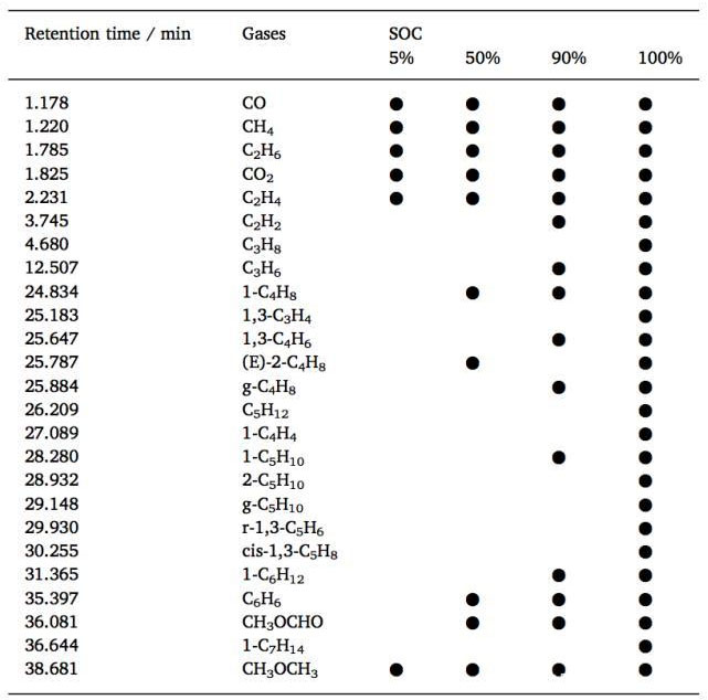 下表為在電池發(fā)生熱失控過程中產(chǎn)生的氣體的成分,從圖中能夠看到隨著電池SoC的升高,電池產(chǎn)生的氣體的種類也在增多,5%、50%、90%和100%SoC的電池在這一過程中產(chǎn)生的氣體種類分別為6、10、15和25種。