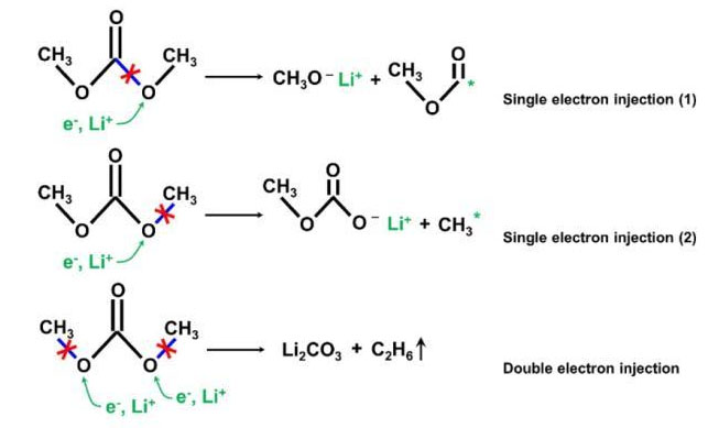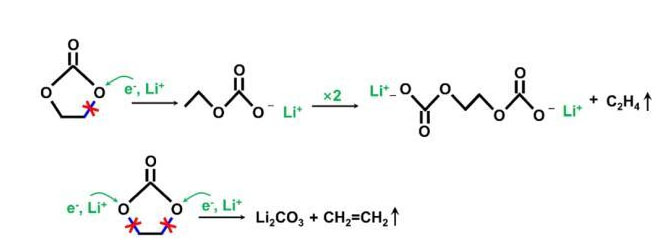 EC溶劑與Li+在高溫下的反應(yīng)如下式所示,產(chǎn)生C2H4和Li2CO3等產(chǎn)物。