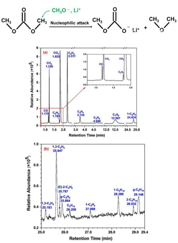 下圖為100%SoC的電池在熱失控中產(chǎn)生的氣體成分,從圖中能夠看到主要的氣體成分為CO、碳?xì)浠衔?、酯類和醚類,這些氣體成分主要來自于電解液溶劑在高溫下的分解反應(yīng)。其中DMC溶劑在高溫下與Li+的反應(yīng)如下式所示,形成CH3*和CH3OCO*自由基,以及C2H6等產(chǎn)物,同時CH3*在高溫下還會分解產(chǎn)生CH2*和H*,從而進(jìn)一步反應(yīng)生成多種復(fù)雜的產(chǎn)物,例如CH4和C2H2,CH3OCHO等。