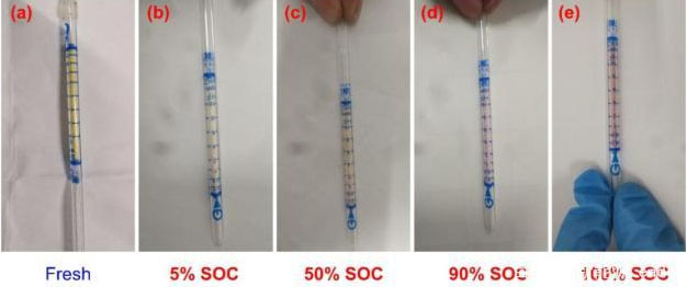 由于傳統(tǒng)的氣質(zhì)聯(lián)用設(shè)備無法探測HF氣體,因此作者采用No. 17L GASTEC試紙對電池在熱失控中產(chǎn)生的氣體中的HF的含量進(jìn)行了檢測,從下圖的檢測結(jié)果可以看到,在較高的SoC狀態(tài)下熱失控電池產(chǎn)生的氣體中含有數(shù)量更多的HF成分(試紙的紅色更深)。