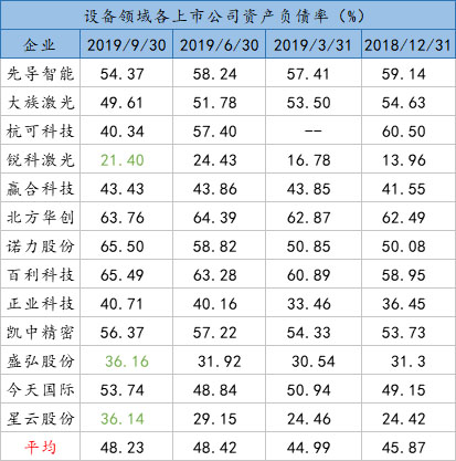 在設(shè)備領(lǐng)域,各企業(yè)相對(duì)比較保守,沒(méi)有一家企業(yè)資產(chǎn)負(fù)債率超過(guò)70%,有3家低于40%,最低只有21.4%,為科銳激光。