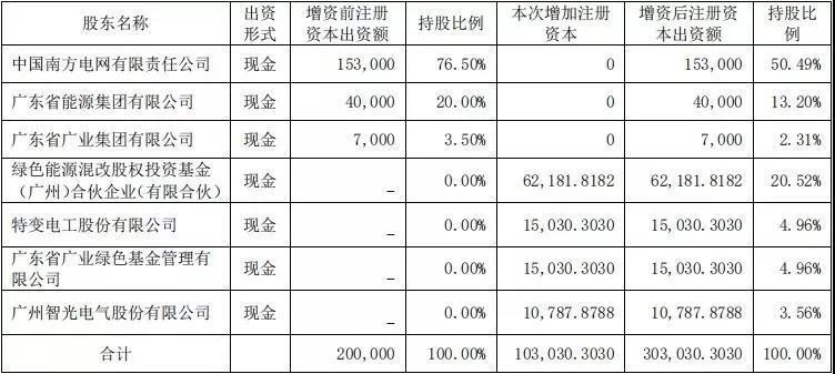 2019年6月28日,該項(xiàng)目掛牌期滿,共征集到6家符合條件的意向投資方,隨后經(jīng)過(guò)三天兩輪緊張的競(jìng)爭(zhēng)性談判,最終確定4家投資方入圍,分別為:綠色能源混改股權(quán)投資基金(廣州)合伙企業(yè)(有限合伙)投資9.2億元,占股20.52%;特變電工投資2.23億元,占股4.96%;廣州智光電氣股份有限公司投資1.6億元,占股3.56%;廣東省廣業(yè)綠色基金管理有限公司投資2.23億元,占股4.96%。