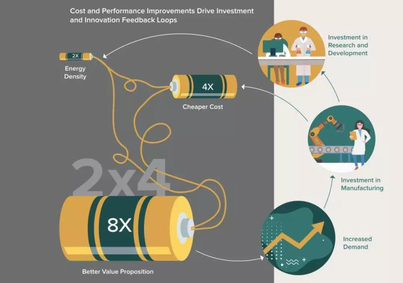 在 2023 年之前,已經實施中和計劃中的電池制造業(yè)總投資約為 1500 億美元。分析人士預計,新的計劃中的電池制造能力的硬性成本將從 2018 年到 2023 年下降一半以上。這讓電池迅速打開新的市場,性能和成本改進的需求將鋰離子電池和新電池技術推向競爭極限,而且這比預期的速度更快。