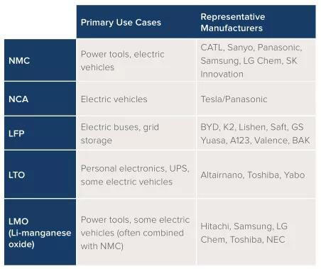 報告統(tǒng)計顯示,電動巴士和電網(wǎng)儲能所用的磷酸鐵鋰電池,制造商有比亞迪、力神、帥福得萬向A123等。電動汽車和電動工具所用的NCM三元電池,制造商企業(yè)有寧德時代、三洋、松下、三星、LG化學以及SKI等。
