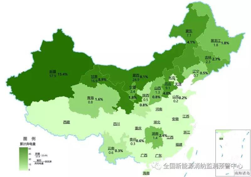 截至9月底各地區(qū)累計(jì)棄風(fēng)電量(億千瓦時(shí))及棄風(fēng)率