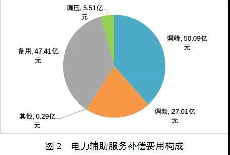 從電力輔助服務(wù)補(bǔ)償費(fèi)用的結(jié)構(gòu)上看,調(diào)峰補(bǔ)償費(fèi)用總額50.09億元,占總補(bǔ)償費(fèi)用的38.44%;調(diào)頻(西北區(qū)域調(diào)頻為AGC(自動(dòng)發(fā)電控制)加一次調(diào)頻,其他區(qū)域調(diào)頻為AGC)補(bǔ)償費(fèi)用總額27.01億元,占總補(bǔ)償費(fèi)用的20.73%;備用補(bǔ)償費(fèi)用總額47.41億元,占比36.38%;調(diào)壓補(bǔ)償費(fèi)用5.51億元,占比4.23%;其他補(bǔ)償費(fèi)用0.29億元,占比0.22%(見圖2)。