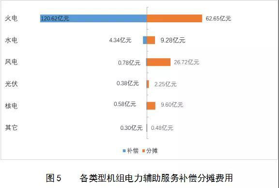 從能源類型的角度來看,電力輔助服務(wù)補(bǔ)償費(fèi)用的補(bǔ)償與分?jǐn)傎M(fèi)用對(duì)比如下(見圖5)。廣東調(diào)頻輔助服務(wù)市場(chǎng)在2019年上半年補(bǔ)償費(fèi)用合計(jì)3.31億元,圖5未計(jì)入該部分費(fèi)用,本報(bào)告除了圖5外各處的補(bǔ)償費(fèi)用均已考慮了廣東調(diào)頻市場(chǎng)產(chǎn)生的費(fèi)用。