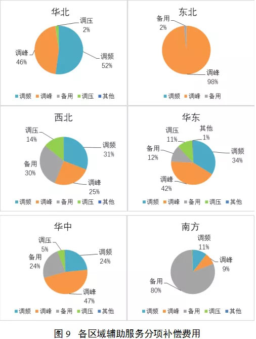 各區(qū)域電力輔助服務(wù)分項(xiàng)補(bǔ)償費(fèi)用如圖9所示,各項(xiàng)費(fèi)用比例構(gòu)成各有特點(diǎn)。