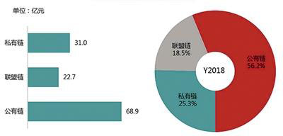 從組成結(jié)構(gòu)方面看,區(qū)塊鏈?zhǔn)袌鼋Y(jié)構(gòu)由公有鏈、聯(lián)盟鏈和私有鏈組成。2018年,公有鏈占區(qū)塊鏈?zhǔn)袌鼋Y(jié)構(gòu)的主要份額,規(guī)模達(dá)到68.9億元,占比56.2%;私有鏈規(guī)模達(dá)到31.0億元,占比25.3%;聯(lián)盟鏈規(guī)模達(dá)到22.7億元,占比18.5%。