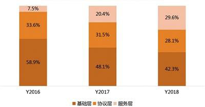 從區(qū)塊鏈平臺細(xì)分領(lǐng)域來看,2018年,服務(wù)層的占比大幅提升,達(dá)到29.6%,增長了22.1個百分點。而基礎(chǔ)層與協(xié)議層占比有小幅下降,分別達(dá)到42.3%和28.1%,但浮動總體趨于平穩(wěn)。